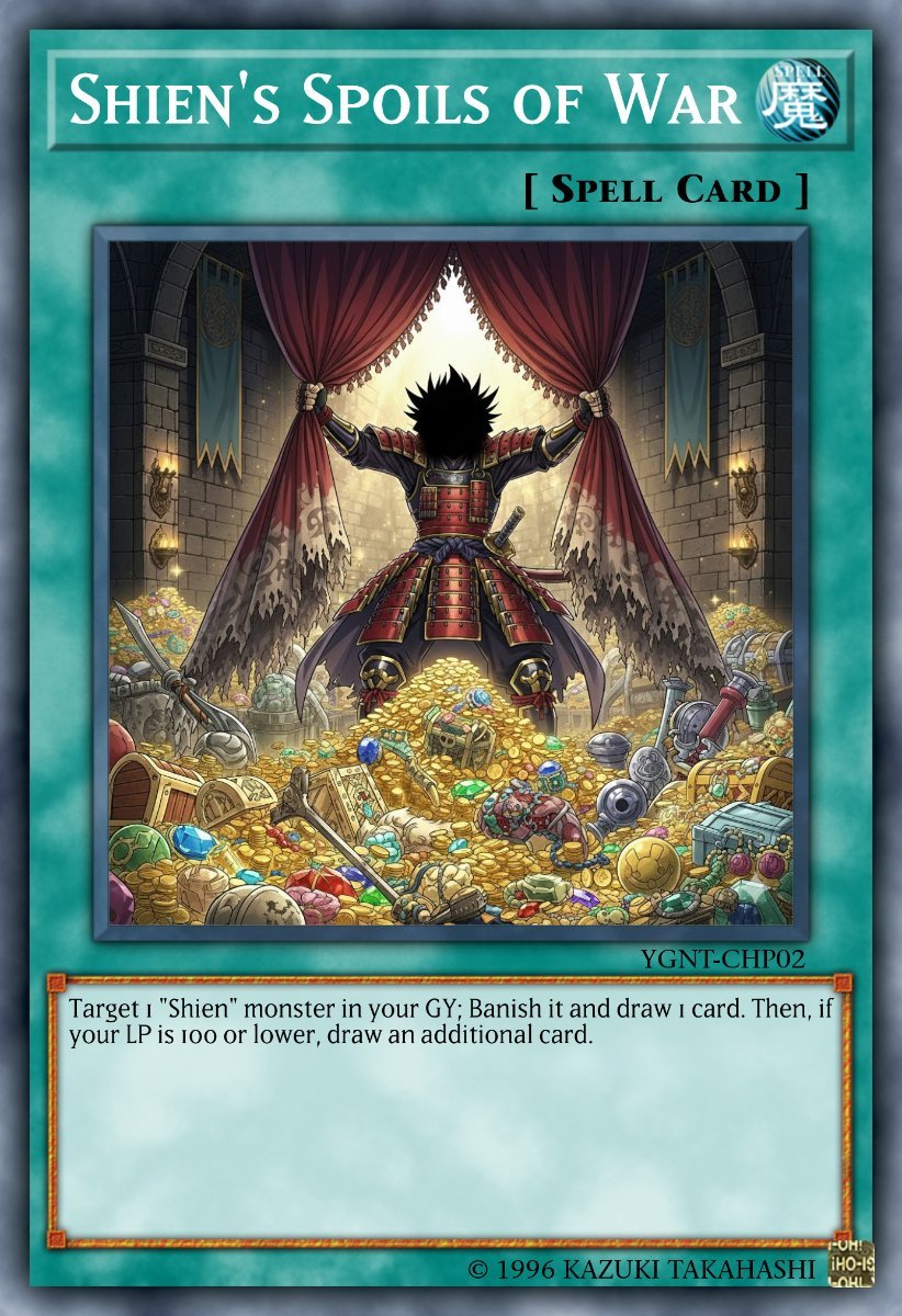 Will Rideout Posted September 23 Report Share Posted September 23 These are two key cards I revealed in the first duel of my fanfic. Playing with the idea of 'Shien'-centered cards, I like the idea of these cards being paired with a successful activation of 'Backs to the Wall'. Quote Link to comment Share on other sites More sharing options...