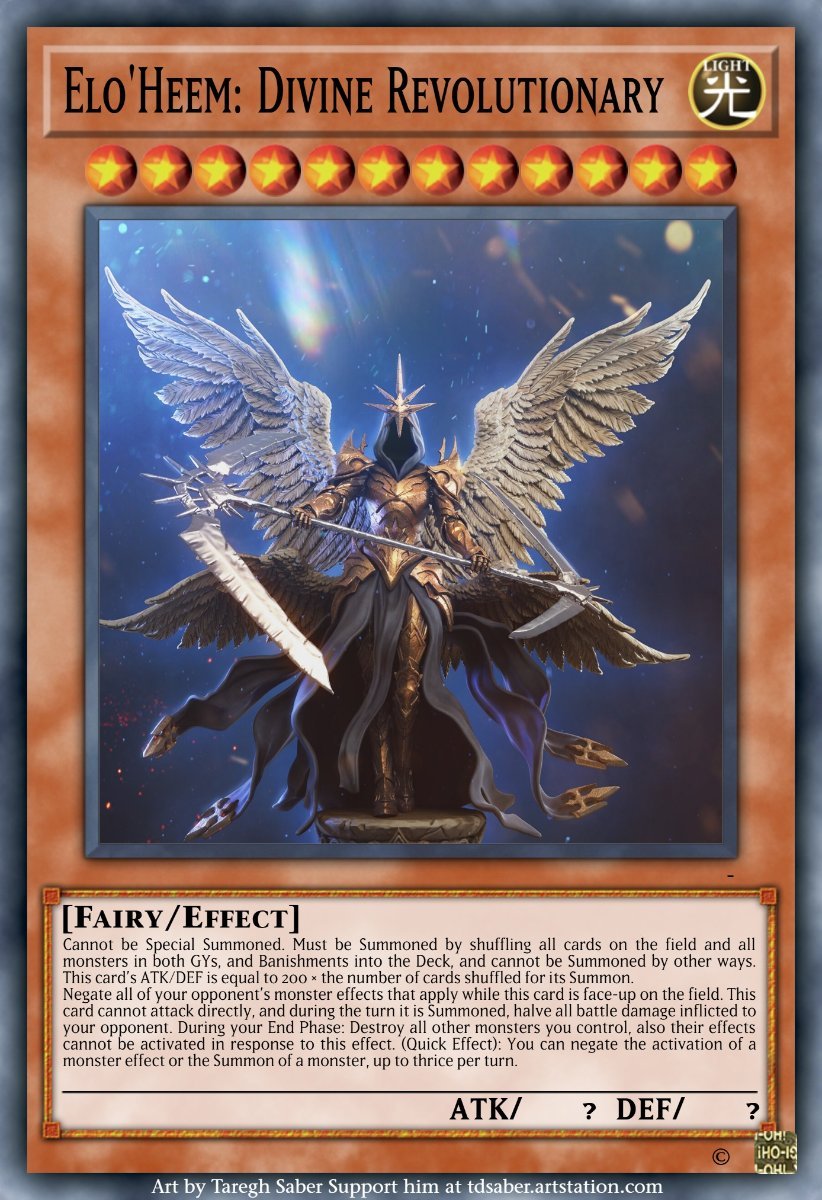 Rjlikestoduel Posted September 25 Report Share Posted September 25 LVL 12 LIGHT Fairy/Effect Quote Cannot be Special Summoned. Must be Summoned by shuffling all cards on the field and all monsters in both GYs, and Banishments into the Deck, and cannot be Summoned by other ways. This card’s ATK/DEF is equal to 200 × the number of cards shuffled for its Summon. Negate all of your opponent’s monster effects that apply while this card is face-up on the field. This card cannot attack directly, and during the turn it is Summoned, halve all battle damage inflicted to your opponent. During your End Phase: Destroy all other monsters you control, also their effects cannot be activated in response to this effect. (Quick Effect): You can negate the activation of a monster effect or the Summon of a monster, up to thrice per turn. Creators Notes: It's an anti-meta card. It resets board states, and shuts off lingering effects so a turn 1 opponent cant pop off and then hit you with 20 negates - least not without a trap card. I actually made it with Master duel in mind. I debated adding tribute protection and it would probably be a better card for it, but I decided to not have that and see what you all think I was thinking Fiber Jar meets Ra Sphere Mode meets Nibiru.Strengths: Good against spammy combo metas. Very nice stat lines. Summon negation is strong. Weaknesses. Spells, Traps and Kaijus. Extremely bricky outside of a turn 2 opening hand. Doesn't end games immediately - just resets the game state a little. Quote Link to comment Share on other sites More sharing options...