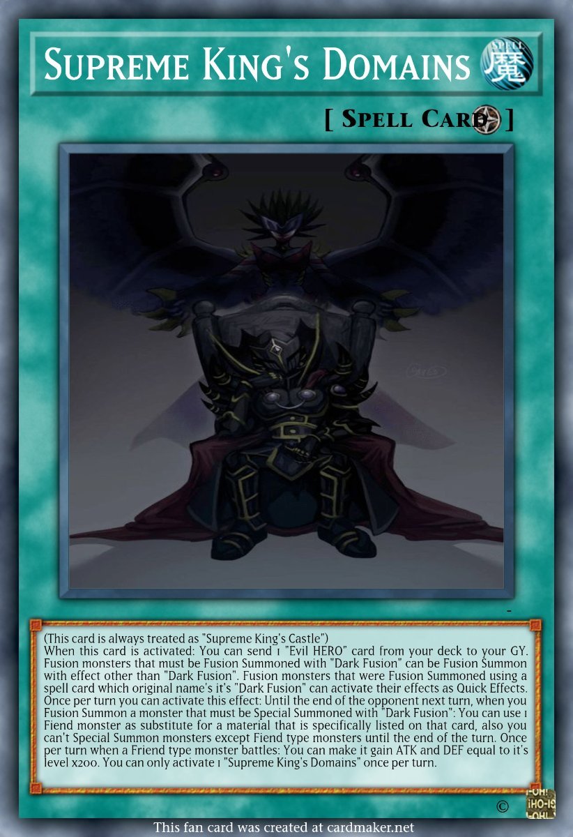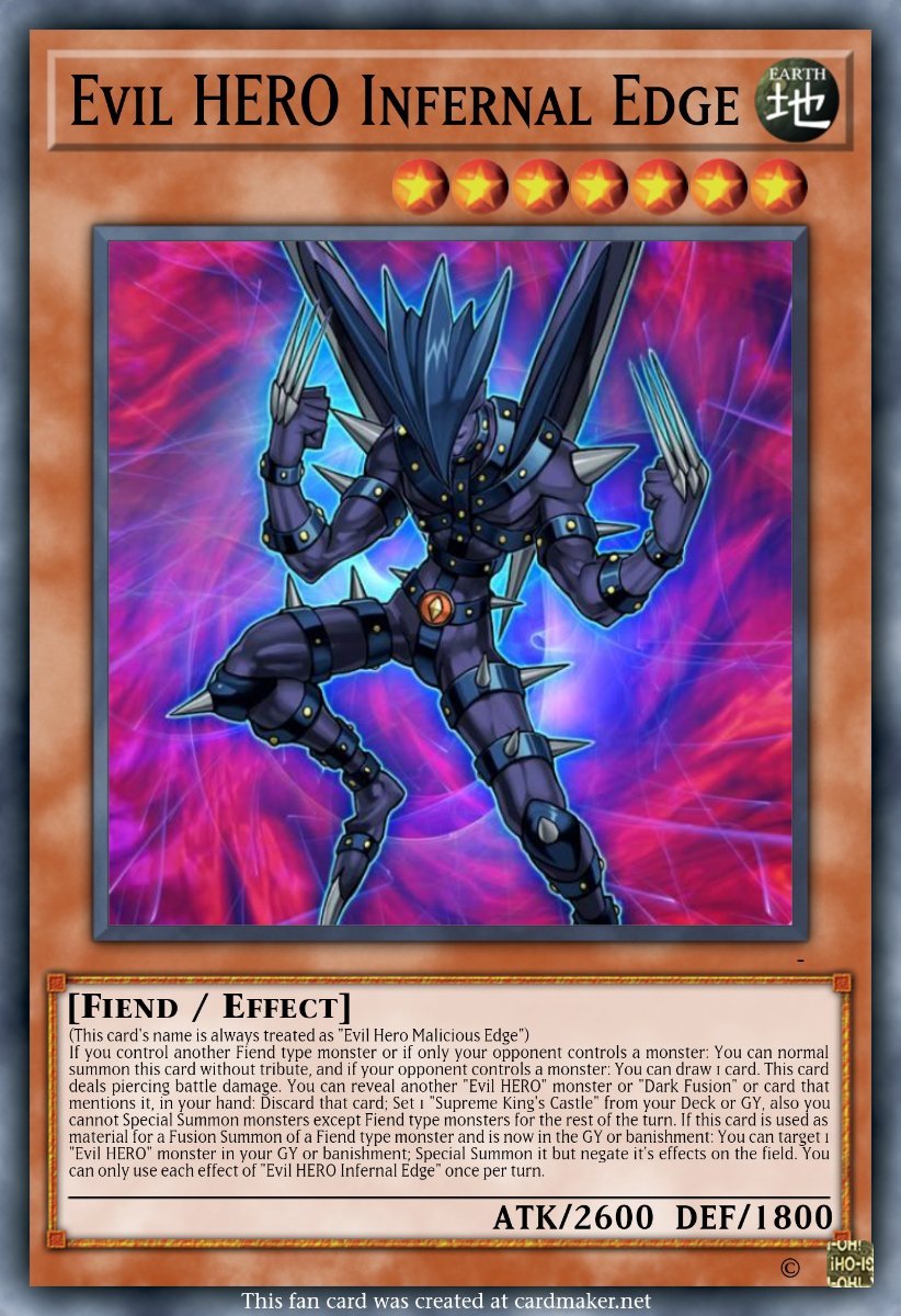 Francisco Navarro Posted yesterday at 03:27 AM Report Share Posted yesterday at 03:27 AM Explanations of why did I made them the way they are (if you care enough to read all this text): As the title indicates this cards entertain the idea of allowing Evil HERO to be able to stand on its own, while keeping the essence of Evil Heroes, so to make sure it doesn't become just part of the pile all cards locks you into only being able to Special Summon Fiend type monsters. The strategy it's using the OG Dark Fusion as many times as possible to make the archetype boss monsters taking advantage of Dark Fusion not being once per turn, despite how much you'll be using it, you could get away with only running one, since many cards can recicle it from grave. The pay off isn't a bunch of negates (other than the counter trap of the actual TCG) but it's to allow you to use both this boss monsters and the real TCG boss monsters effects as quick effects, since the field spell have the effect to allow you to use their effects as Quick Effects if they were Fusion Summoned using "Dark Fusion", keep in mind this only applies to monsters that were Summoned with OG Dark Fusion, no to monsters that were Summoned with effect that treat themselves as "Dark Fusion", the other important aspect of this field spell is to fix one of the issues of Evil HEROES fusion monsters and that is the need for them to be fused using strict monsters, almost all of them being normal monsters, so to allow you to not run any of the terrible normals, the field spell has the effect to allow you to use any "Fiend" as substitute for those names. The second part of the game plan of the deck is using the opponent monsters as materials for a Fusion Summon, since Evil HERO has a strong connection with Super Poly, since that card is indirectly responsable for the Evil Heroes to exist in the first place. Infernal Raider already sets up Super Poly, but now Malicious Thorns if it was Fusion Summoned using OG Dark Fusion, so it's effects become Quick Effects, allow you to Fusion Summon during your opponent's turn by targeting up to 2 of their monsters to use as materials, which normally wouldn't be so useful because of the strict materials of the Fusions, but Malicious Thorns can also make so you can treat one of the targeted monsters as an Evil HERO/Fiend/Level 6 monster, so you're able to fuse them easily. Finally Evil HERO Malicious Slash is the retrain of Evil HERO Malicious Fiend the OG boss monster of the archetype, while it keeps it's strict materials, that's less of a problem with the field spell, he's mainly a battle oriented boss monster, he'll allow you to kill your opponent quickly, while giving your other monsters targeting protection. One problem the OG had its that you could completely avoid his effect by just not entering the Battle Phase, so this retrain aims to fix that, if your opponent has Special Summoned 5 or more effects but they still don't control any monsters, probably because you fuse them away all or you used Malicious Bane as a Quick Effect Rigeki, you can immediately end their Main Phase and go to the Battle Phase, where he can now summon a token, that cannot be destroyed by battle and can attack an amount of times equal to the Fusion monsters you control and thanks to his effects carried over from his OG self, the Token will be forced to attack him and since he has 3500 ATK, if you set up well that basically guarantees the win, keep in mind that if your opponent summons a monster after this effect resolves, the Token will render unable to attack, so even after the effect resolves, they still ger the chance to save themselves, which with such a game ending scenario I believe it's fair. Well that's about it, I always loved how cool the Evil Heroes looked, (Malicious Bane is my favorite card it terms of appearance) but I was always kinda of disappointed that Evil Heroes it's practically unplayable without mixing them with the other HERO archetypes, to be honest I don't really like the approach Konami took handling HERO, mixing them all into one big archetype, which I don't like because I feel that decision has made that every HERO archetype has lost what gave them personality, now all of a same deck where you only play "the good ones", I feels wrong for me idk how you feel, whatever. I doubt any has readed until here, but if any of has, what do you think about this support concept? Do think they're OP? They are mid, or toxic? I put a lot of thought into them, so I would like to know how you feel about it, thank you for reading, and until my unhealthy hiperfixation hits me with ideas again! Quote Link to comment Share on other sites More sharing options...