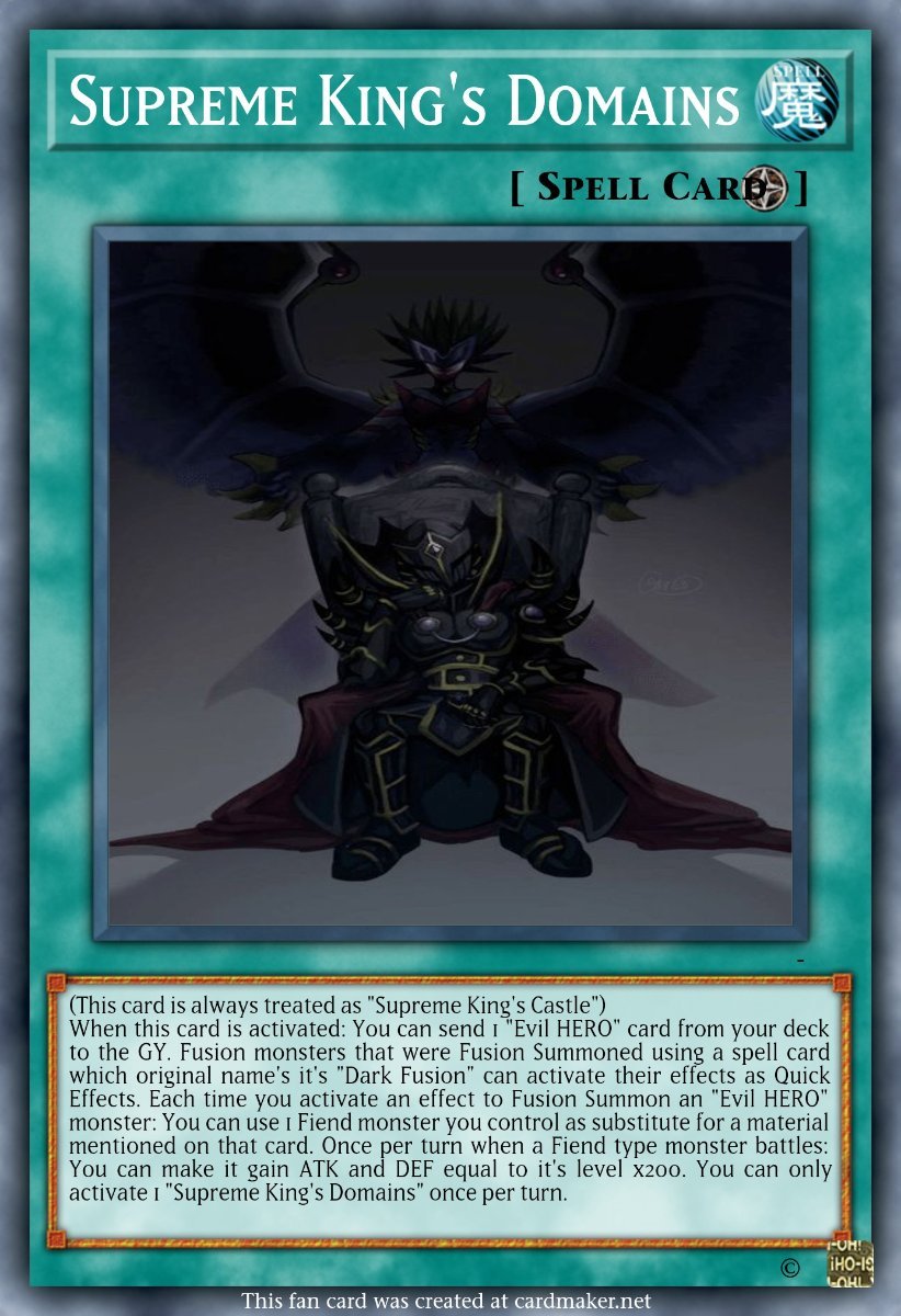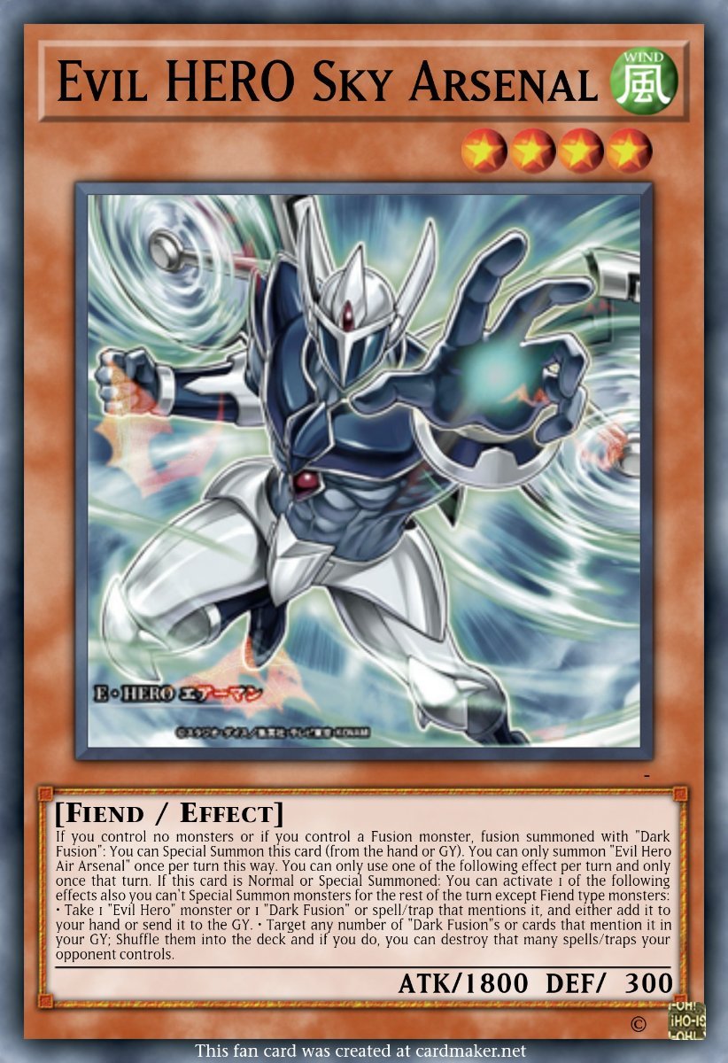 Francisco Navarro Posted 22 hours ago Report Share Posted 22 hours ago This cards aim to make "Evil HERO" it's own deck, separate from the large HERO pile. Since the history of Evil HERO and Super Poly is very close to each other, I decided to give the deck a clear gimmick: Fusing constantly using the opponent's monsters as materials. The new Fusion monsters have one more gimmick though, normally their effects are spell speed 1, but thanks to the field spell if they are summoned using the OG "Dark Fusion" their effects become spell speed 2! This also counts for the older Evil HERO fusions, so if you make Malicious Bane with "Dark Fusion" you get a Quick Effect Raigeki. Quote Link to comment Share on other sites More sharing options...