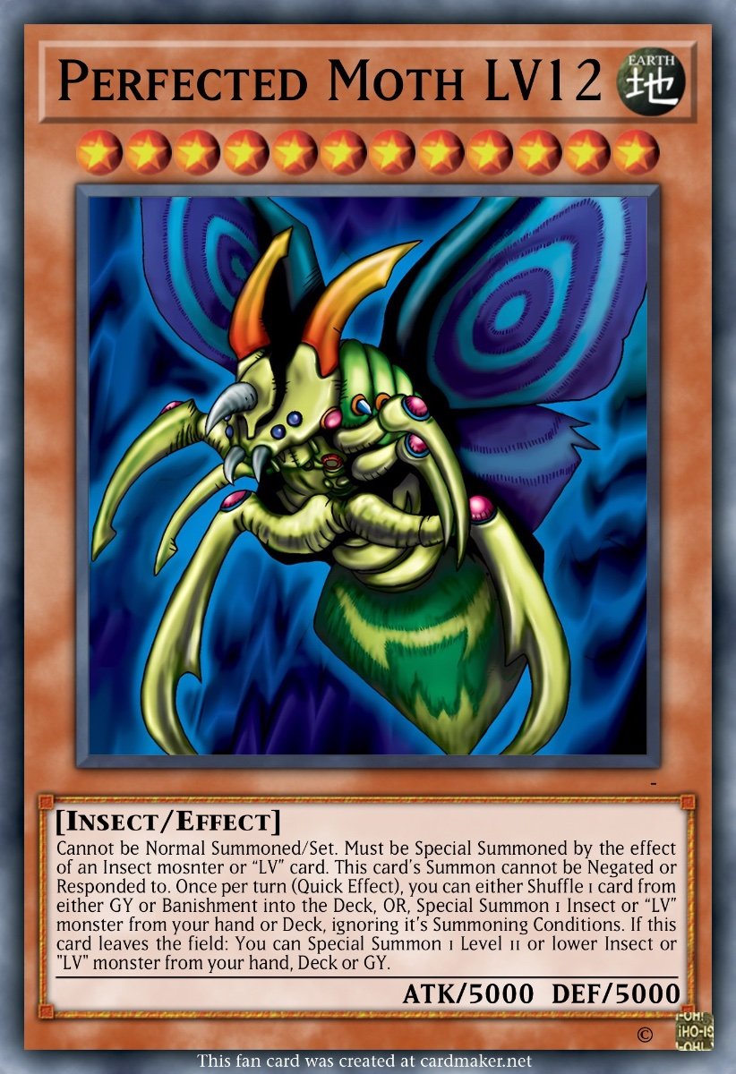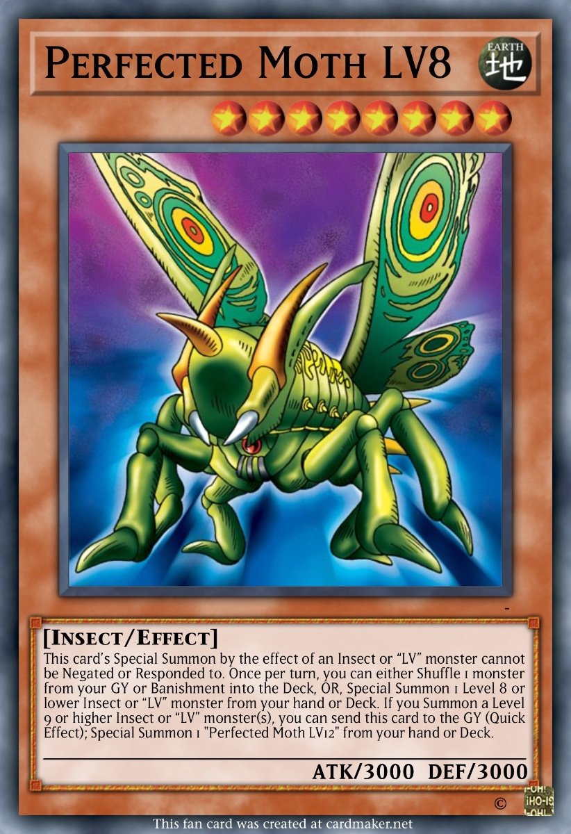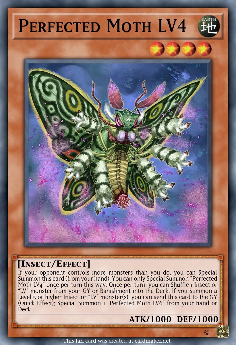 But First He Lit It On Fire Posted Monday at 09:20 PM Report Share Posted Monday at 09:20 PM Perfected Moths LV’S 4/8/12 EARTH Levels 4/8/12 Insect/Effect ATK/DEF: 1000/3000/5000If your opponent controls more monsters than you do, you can Special Summon this card (from your hand). You can only Special Summon "Perfected Moth LV4" once per turn this way. Once per turn, you can Shuffle 1 Insect or “LV” monster from your GY or Banishment into the Deck. If you Summon a Level 5 or higher Insect or “LV” monster(s), you can send this card to the GY (Quick Effect); Special Summon 1 "Perfected Moth LV6" from your hand or Deck. This card’s Special Summon by the effect of an Insect or “LV” monster cannot be Negated or Responded to. Once per turn, you can either Shuffle 1 monster from your GY or Banishment into the Deck, OR, Special Summon 1 Level 8 or lower Insect or “LV” monster from your hand or Deck. If you Summon a Level 9 or higher Insect or “LV” monster(s), you can send this card to the GY (Quick Effect); Special Summon 1 "Perfected Moth LV12" from your hand or Deck. Cannot be Normal Summoned/Set. Must be Special Summoned by the effect of an Insect mosnter or “LV” card. This card’s Summon cannot be Negated or Responded to. Once per turn (Quick Effect), you can either Shuffle 1 card from either GY or Banishment into the Deck, OR, Special Summon 1 Insect or “LV” monster from your hand or Deck, ignoring it’s Summoning Conditions. If this card leaves the field: You can Special Summon 1 Level 11 or lower Insect or "LV" monster from your hand, Deck or GY. Quote Link to comment Share on other sites More sharing options...
