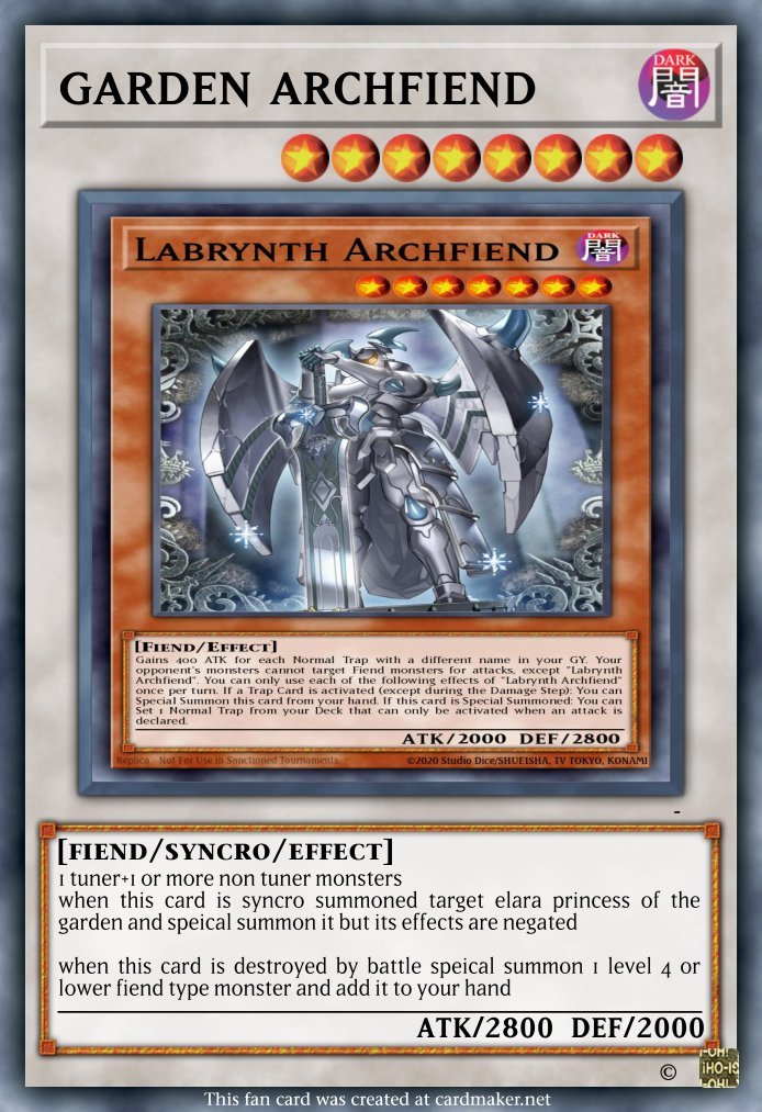 alice56 Posted February 17 Report Share Posted February 17 (edited) every yugioh card has a story behind them and this arcytype is no different core set choas reigns elara princess of the garden if this card is normal summoned you can add 1 magical garden estate from your deck to your hand when this card is destroyed by battle banish 1 fairy in your grave speical summon this card in attack posistion but next it leaves it is bannished ryan traveler of the beanstalk FLIP when this card would be destroyed by battle speical summon 1 elara princess of the garden from your banishment and negate the destruction chaos reigns extra deck suport garden archfiend 1 tuner+1 or more non tuner monsters when this card is syncro summoned target elara princess of the garden and speical summon it but its effects are negated when this card is destroyed by battle speical summon 1 level 4 or lower fiend type monster and add it to your hand spells and traps enchanted garden playtime only equip to elara princess of the garden in your banishment but it has its effects negated garden estate labrynth when a fiend or fairy type monster is summoned spiecal summon 1 gargoyle token(LVL1 FIEND_0ATTK_0 DEFF) fiend chaos structure deck arianna the enchanted castle servant pendilum effect if you dont have another fiend in your pendilum scale this cards scale becomes 4 if this card in your Pendulum zone is targeted for a card effect speical summon it to a zone a fiend link monster points to but you cannot speical summon monsters from the extra deck except fiend monsters monster effect cannot be normal summoned/set and must be speical summoned by its own pendilum effect i if this card in your Pendulum zone is targeted for a card effect speical summon it to a zone a fiend link monster points to but you cannot speical summon monsters from the extra deck except fiend monsters this card gains 500DEFF for each fiend type monster that points to it arriane the enchanted castle servant if you dont have another fiend in your pendilum scale this cards scale becomes 4 if this card in your Pendulum zone is targeted for a card effect speical summon it to a zone a fiend link monster points to but you cannot speical summon monsters from the extra deck except fiend monsters cannot be normal summoned/set must be speical summoned by its own pendilum effect if this card in your Pendulum zone is targeted for a card effect speical summon it to a zone a fiend link monster points to but you cannot speical summon monsters from the extra deck except fiend monsters this card gains 500ATTK for each fiend type monster that points to it extra deck fiend choas support lovely labrynth of the enchanted castle 2+ fiend monsters when this card is link summoned and you control another fiend or fairy type monster draw 2 cards but discard 1 card in your hand this card gains 1000 for each fiend monster it points to or in the GY when another monster would be destroyed by battle and sent to the grave bannish 1 fiend type monster negate the destruction and if you do speical summon this monster but banish the attack target lovely lady labrynth of the enchanted castle lady labrynth of the enchanted castle+1 or more fiend monsters must be fusion summoned or speical summoned by bannishing the above materials and cannot be speical summoned by other ways if bannishment you don't use pollimerzation this card gains 1000 ATTK&DEFF for each fiend type monster used in its fusion summon when this card is destroyed by battle and sent to the grave you can speical summon 1 lady labrynth of the enchanted castle in your grave but you can only use each effect of Lovely labrynth of the enchanted castle once per turn spells and trap supourt corrination of the lady labrynth fusion summon 1 lovely lady labrynth of the enchanted castle by bannishing materials face up from your hand, field or grave but you must control a fiend link monster to activate and resolve the grave effect Edited February 17 by alice56 Quote Link to comment Share on other sites More sharing options...