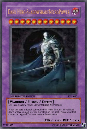 ShadowshadeNecroPower Posted June 25, 2008 Author Report Share Posted June 25, 2008 I dont know how to get the card posted! i only know how to make attachments!!! Link to comment Share on other sites More sharing options...