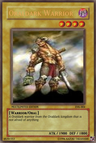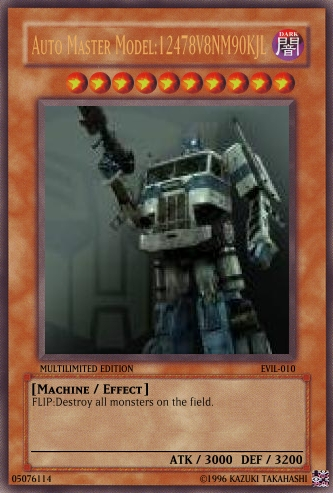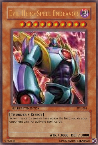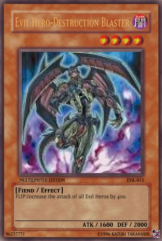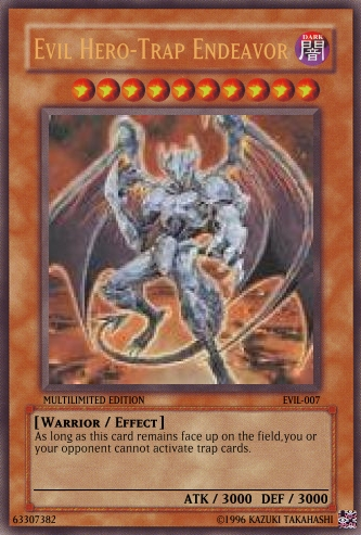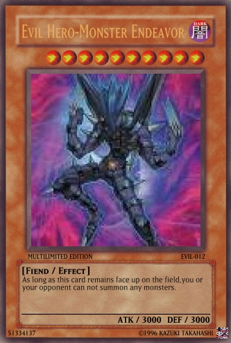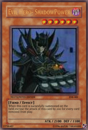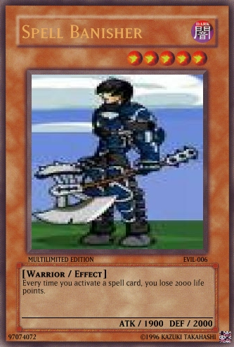 Silas Angel Posted June 24, 2008 Report Share Posted June 24, 2008 Dark Hero is extremely overpower!! By the way, whats its attack?Shadow Hero is pretty kool, but you have a little spelling errors.I love the Rat! so far, my favthe Warrior is goodi like the Synchron but no one will tell me how the synchro is used.ITS PEANUT BUTTER JELLY TIME!!! I love it!The Auto Master is a little over powered; gets to destroy all monsters then can give 3000 directly.I like the pillar, but i wouldv made it into a field card; just my oppinioni like the blaster, really stablethe Monster Endeavor is, in my oppinion, the best hereSpell Endeavor is good but a little overpoweredi like the Spellcasterthe Rat is perfect!well, the pic is from cartoon network; i thought that was kool. the grammer could be alot better, and what do you mean by "Brain Control"? the spell card or what?I like the Banisher, i would make that go both ways. By the way, im not tryin to be critical, just helpful. but, just like the pics i have, theyr very blurry and could be better; someone suggested this site for the art:http://www.deviantart.com but next time instead of attaching the cards, use the code. if you click on the card after your done making it, right under the card will be an image shack code that you can put in the post =) hope iv helped a bit overall i give you a 6/10 Link to comment Share on other sites More sharing options...