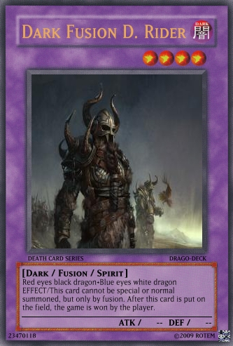 destructocon Posted May 26, 2009 Report Share Posted May 26, 2009 Please sign me up, I'm destructocon. If you need to check my skill here is a card from my dragon deck: Name:Dark Fusion D. RiderLevel:4Type:DarkDescription: Red eyes black dragon+Blue eyes White dragonNormal or special summoned, but only by fusion.After this card is put on the field, the game is won by the player.ATK:--DEF:-- Link to comment Share on other sites More sharing options...