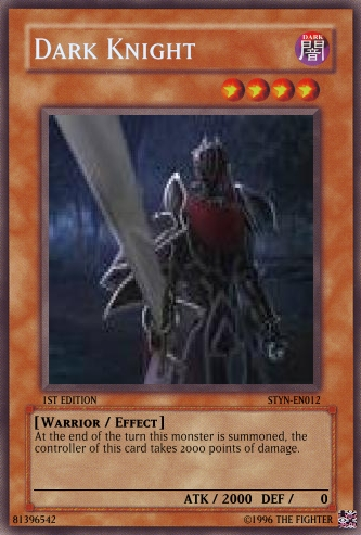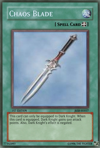 Gogeta™ Posted July 5, 2008 Report Share Posted July 5, 2008 1) The pics could be better.2) Try posting your cards the right way.3) OCG needs help. Dark Knight: During the end of your turn, if this card was Normal Summoned you take 2000 points of damage. Chaos Blade: This card can only be equip to "Dark Knight". Increase the ATK of the equip monster by 500 points. As long as this card remains equip to "Dark Knight" negate the monsters effect. These changes will make the card much better. Link to comment Share on other sites More sharing options...