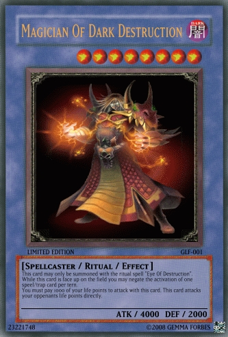 bazzabaz Posted July 8, 2008 Report Share Posted July 8, 2008 It's good, but remember in a ritual don't forget to include how many tribute monsters required on the monster card aswell ;) Lower it's ATK A LOT, to about 2600, and it would be an ass kicking card!Because 4000 ATK is just a bit too strong. XD And please don't use attacthments, ask sum1 here if your not sure on how to post ur cards otherwise ;) 7/10- gr8 for a begginer, keep em comin Link to comment Share on other sites More sharing options...