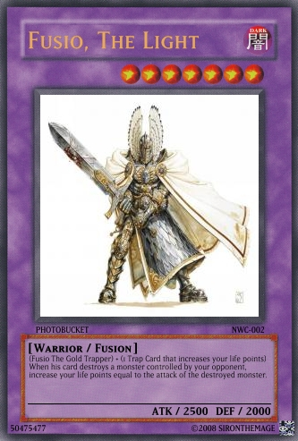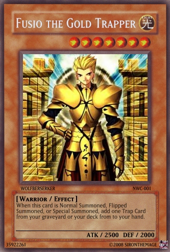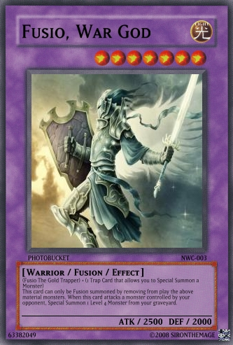 sironthemage Posted July 16, 2008 Report Share Posted July 16, 2008 Here is a new monster for Kale's Fan Fic. He can combine with trap cards. I will post his fusions as soon as I can get some good pictures. If you know where some pictures are please PM me. (Fusio The Gold Trapper) + (1 Trap Card that increases your life points)This card can only be Fusion Summoned by removing from play the above Fusion Mateial monsters. When this card destroys a monster controlled by your opponent, increase your life points equal to the attack of the destroyed monster.(Fusio The Gold Trapper) + (1 Trap Card that allows you to Special Summon a Monster)This card can only be Fusion summoned by removing from play the above material monsters. When this card attacks a monster controlled by your opponent, Special Summon 1 Level 4 Monster from your graveyard. Link to comment Share on other sites More sharing options...