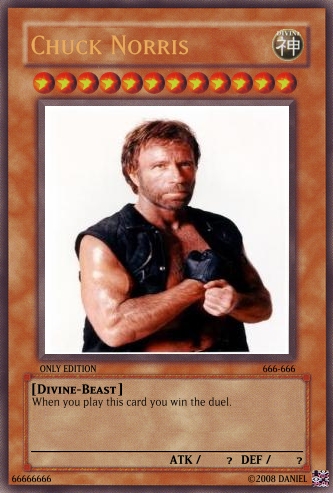 MD Productions Posted July 21, 2008 Report Share Posted July 21, 2008 I so win this. I also have a Chuck Norris card. Link to comment Share on other sites More sharing options...