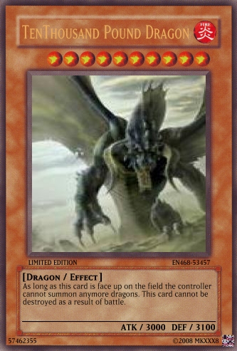 Prada Posted July 16, 2008 Report Share Posted July 16, 2008 Heh, I've used that image in a card before. Image IS overused though, and the name isn't all that great to me. The OCG isn't good (Just look at the OCG thread. Mine used to be horrible, now it's better), I'd say it was overpowered, considering no Dragon-types can be played on the opponents field, and it can't be destroyed as a result of battle. And the image is blurry. My rating is.......3/10 Link to comment Share on other sites More sharing options...