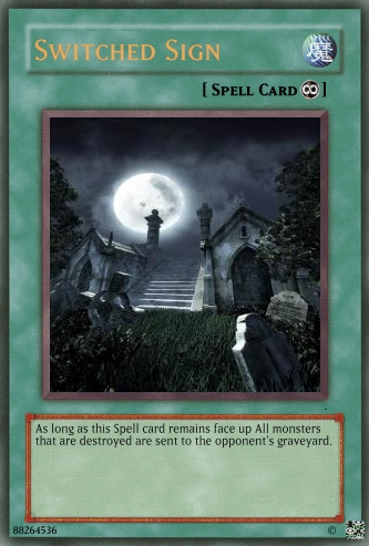 {Verifying...} Posted August 3, 2008 Report Share Posted August 3, 2008 Yo guys, I hope its not too late, sorry if "Switched Sign" is the type of spell card you are looking for.:lol: BTW: The pic's aren't mine. Link to comment Share on other sites More sharing options...