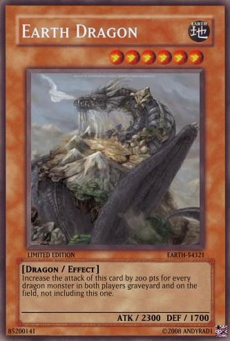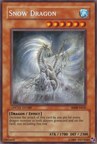 D-Striker Posted August 5, 2008 Report Share Posted August 5, 2008 Yes i want you to make me a card.Name:Snow and Earth DragonAttrabute:EarthLv:8Rarity:Ultra RareCirculation:Limited EditionSet ID:Snow-EarthType: DragonMonster,Effect:This card can only be summoned by tributing Snow Dragon and Earth Dragon. Increase the attack of this card by 200 pts for every dragon monster in both players graveyard and on the field, not including this one.Atk:4000 Def:4000By:Andyrad1 Year:2008 Can you find a picture of a dragon with snow and Earth. Here are the 2 cards i made for the tribute. Link to comment Share on other sites More sharing options...