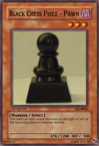 herodemon1992 Posted August 8, 2008 Report Share Posted August 8, 2008 I just started making a new chess deck since I like to play so much. I had a hard time finding decent pics for the cards' date=' so if you happen to find better ones, please pm them to me.NOTE: I took pics of the chess piece monsters as I could not find a set of pictures showing all the individual pieces in color and power. If you send in pics for these monsters, send in matches so that it seems like they would fit in a deck. TY![img']http://i244.photobucket.com/albums/gg27/aisumugendai/blackpawn.png[/img] These are the spell cards that I have finished. Again, if you have suggestions for better pictures, please pm me. And last, I have these traps done: If you could, rate cards by just the effects. I know most of the images suck, so I want to know how reallistic this deck would be and if Yu-Gi-Oh would actually make the cards... i think it rocks i love chessI think it rocks I love chess Link to comment Share on other sites More sharing options...