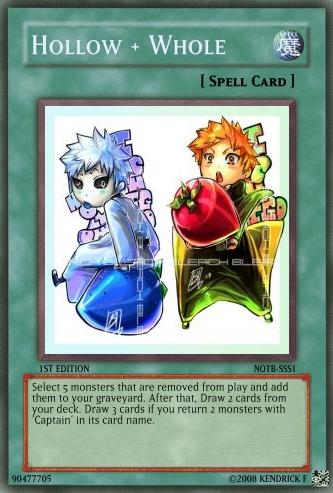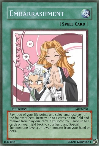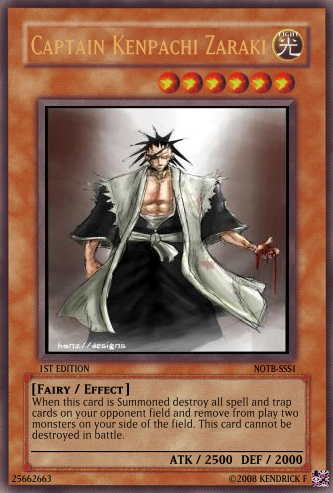 Saturn of Elemia Posted August 5, 2008 Report Share Posted August 5, 2008 Lemme see if I can fix your OCG: EmbarassmentPay 1000 Life Points to activate one of the following effects:• Destroy 2 cards on the field and remove 1 card you control from play.• Return 2 cards on your field to your hand to Special Summon 1 Level 4 or lower monster from your hand or Deck. Hollow + WholeReturn 5 or your monsters that are removed from play to your Graveyard. Afterwards, draw 2 cards. If you return 2 or more cards with "Captain" in their name, draw 3 cards instead. Captain Kenpachi ZarakiWhen this card is Summoned, destroy all Spell and Trap Cards on your opponent's field and remove 2 monsters on your field from play. This card cannot be destroyed by battle. The effects are fairly overpowering. You need to balance out the effects some. 8) Link to comment Share on other sites More sharing options...