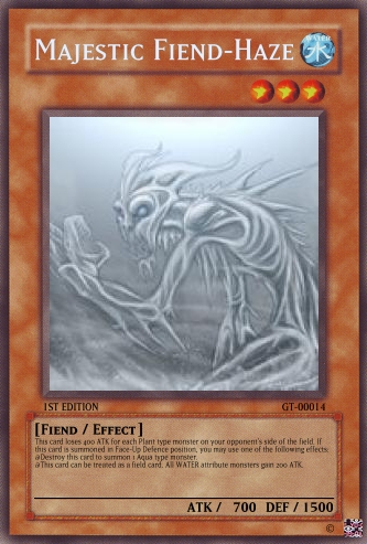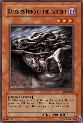 Evil_Nightshroud Posted August 7, 2008 Report Share Posted August 7, 2008 Pretty cool for a card but i don't get is attack is 700 if i lose 500 will remain with 200 but if your opponent has 2 face up plants this Majestic Fiend will have negative -300 and at a field spell weird card.7\10 make it 100 attack for every plant your opponent controls.The other card Darkness Fiend Of Twilight isLike this flipsend 5 cards from the top of the deck to the grave.This card gain 1000 attack points for every dark attribute monsters.This card cannot attack directly.8\10 this the weirdest card maybe i can find weirder cards.Pretty good job. Link to comment Share on other sites More sharing options...