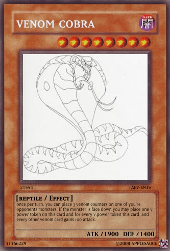 Dark Insectivore Posted September 10, 2008 Report Share Posted September 10, 2008 Do what the first 2 said, and Venom Cobra is already a card [EARTH/Reptile-Type/Level 4/ATK (I don't know)/DEF 2000/no effect]. Link to comment Share on other sites More sharing options...