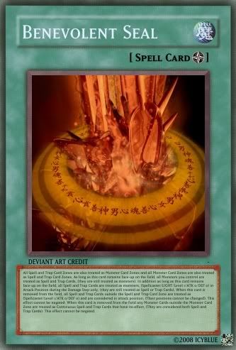 Icy Posted September 23, 2008 Report Share Posted September 23, 2008 Umm... Link to it disappeared and he removed the card from his PB, but I will check later. Character count: 2239[spoiler=Effect]This card may only be activated if your opponent attacks one of your monsters with "Dark" in its name. On the Main Phase of the turn your opponent attacked one of your monsters with "Dark" in its name, Special Summon that monster to your opponent's side of the field in Defense Position. That monster cannot be used as a Tribute for a Tribute Summon (or Set). That monster cannot switch to Attack Position or attack as long as it remains in face-up Defense Position on your opponent's side of the field. If your opponent has a monster with "Dark" in its name, during your Standby Phase, you may discard 1 card from your hand, and take 1 monster with "Dark" in your Deck and place it on your hand. If you opponent has 2 monsters with "Dark" in its name, during your End Phase, you and your opponent may draw 2 cards randomly from your Decks, if one of the drawn card was DARK Fiend-Type monster, you may discard it and send it to the Graveyard, if it was a Spell, Trap, or non-DARK and non-Fiend-Type monster, discard it and send it to the Graveyard. If your opponent has 3 monsters with "Dark" in its name, you may pay 500 Life Points to Special Summon 1 monster with "Dark" in its name until the End Phase of the turn you activated this card. If your opponent has 4 monsters with "Dark" in its name, you may place all monsters with "Dark" in its name from your and your opponent's Decks. You may discard any number of monsters with "Dark" in its name at anytime in the duel, if you drew them this way. If your opponent has 5 monsters with "Dark" in its name, you may place all monsters with "Dark" in its name from your and your opponent's Decks. You may discard all the monsters with "Dark" in its name if they were drawn this way. If monsters with “Dark” in its name were discarded this way, you may Special Summon all monsters with "Dark" in its name from your and your opponent's Graveyard. All monsters Special Summoned this way may attack directly. This card is destroyed the turn you activate one of these effects. When this card is destroyed, inflict Direct Damage to your Life Points equal to the amount of damage you dealt to your opponent's Life Points with the effect of this card. ooh and for an active member I have more than for my Benevolent Seal card.Character Count: 1040Link: http://i242.photobucket.com/albums/ff317/masterblue20xx/benevolentseal.jpg[spoiler=Effect]All Spell and Trap Card Zones are also treated as Monster Card Zones and all Monster Card Zones are also treated as Spell and Trap Card Zones. As long as this card remains face-up on the field, all Monsters you control are treated as Spell and Trap Cards, (they are still treated as monsters). In addition as long as this card remains face-up on the field, all Spell and Trap Cards are treated as monsters, (Spellcaster/LIGHT/Level 1/ATK 0/DEF 0) in Attack Position during the Damage Step only, (they are still treated as Spell or Trap Cards). When this card is removed from the field, all Spell and Trap Cards outside the Spell and Trap Card Zone are treated as (Spellcaster/Level 1/ATK 0/DEF 0) and are considered in attack position, (Their positions cannot be changed). This effect cannot be negated. When this card is removed from the field any Monster Cards outside the Monster Card Zone are treated as Continuous Spell and Trap Cards that have no effect, (They are considered both Spell and Trap Cards). This effect cannot be negated. Link to comment Share on other sites More sharing options...