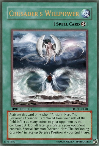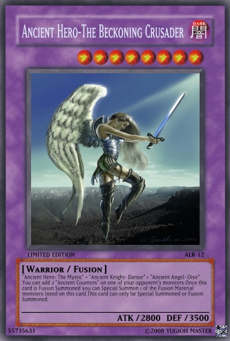 Ancientspellcaster Posted October 5, 2008 Report Share Posted October 5, 2008 ANCIENT-HERO THE BECKONING CRUSADER "Ancient Hero- The Mystic" + "Ancient Knight- Darsor" + "Ancient Angel- Oisir"You can add 2 "Ancient Counters" on one of your opponent's monsters.Once this card is Fusion Summoned you can Special Summon 1 of the Fusion Material monsters listed on this card.This card can only be Special Summoned or Fusion Summoned. CRUSADER'S WILLPOWER Activate this card only when "Ancient- Hero The Beckoning Crusader" is removed from your side of the field.Inflict as many points to your opponent as the combined ATK of all face up monsters your opponent controls. Special Summon "Ancient- Hero The Beckoning Crusader" in face up Defense Position at your End Phase.[/size] Link to comment Share on other sites More sharing options...