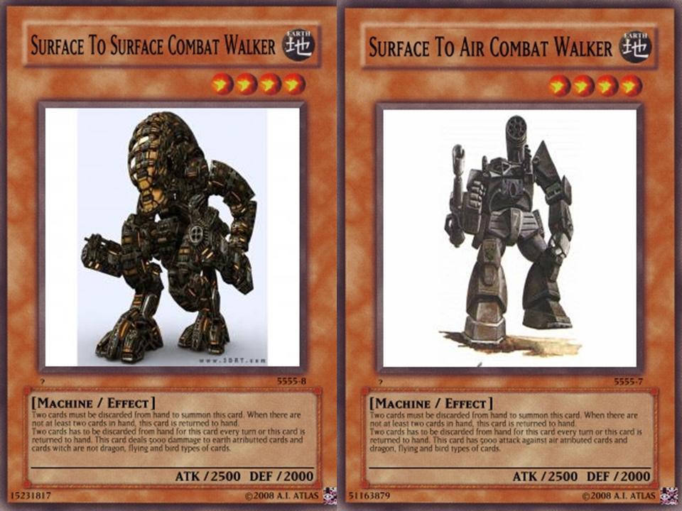 FutureWorldYear5555 Posted October 19, 2008 Report Share Posted October 19, 2008 These updated cards are somewhat balanced:(Click the thumbnail to prieview) If you can't read the effects, these are the effects: Surface To Air Combat Walker:Two cards must be discarded from hand to summon this card. When there are not at least two cards in hand, this card is returned to hand.Two cards has to be discarded from hand for this card every turn or this card is returned to hand. This card has 5000 attack against air atributed cards and dragon, flying and bird types of cards. Surface To Surface Combat Walker:Two cards must be discarded from hand to summon this card. When there are not at least two cards in hand, this card is returned to hand.Two cards has to be discarded from hand for this card every turn or this card is returned to hand. This card has 5000 attack to earth atributted cards and cards witch are not dragon, flying and bird types of cards. This is another card, A Fusion Card: Your Opinion? Link to comment Share on other sites More sharing options...