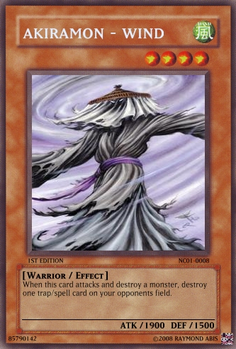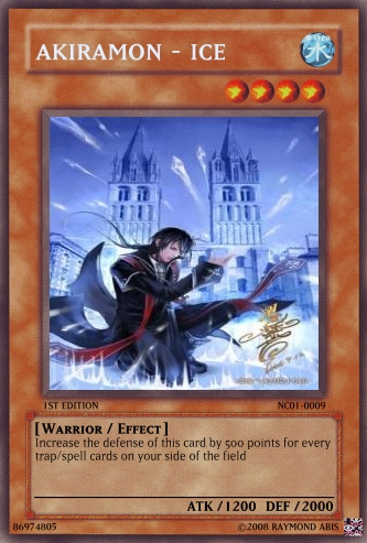 Kazerak Posted October 23, 2008 Report Share Posted October 23, 2008 OK, Round two.. I guess   This monster can not be Normal Summoned or Set. This monster can only be Special Summoned by offering one monster "Of the 7th Gate" as a tribute while you have 3 or more light attribute monsters in your graveyard. Increases this monsters attack points by 100 for each Light attribute monster in your graveyard, and 200 points for each monster "Of the 7th Gate" in your graveyard. Decrease this monsters attack points by 100 for each Dark attribute monster in your graveyard. Link to comment Share on other sites More sharing options...