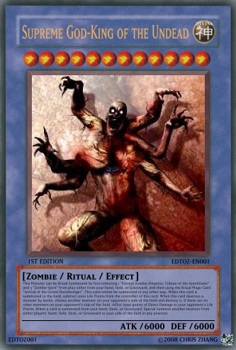 xxdemonicfuxoffxx Posted November 2, 2008 Report Share Posted November 2, 2008 I'm currently working on a series of decks called "Expert Decks". This series is similar to structure decks in that they are both based on a single type. The difference is that these decks are EXCLUSIVELY for one type, and any other type will fare extremely badly in these decks. The cards in it are "expert", extremely powerful, but have high costs to summon/activate. The card under is the first card in my Expert Deck "Tribute of the Zombies", based on Zombie-Types. I hope you like it. :D Because the card text is so small, I'm pasting the card description/effect here: This Monster can be Ritual Summoned by first removing 1 "Eternal Zombie Emperor, Tribute of the Annihilator" and 3 "Zombie Spirit" from play either from your hand, field, or Graveyard, and then using the Ritual Magic Card "Arrival of the Grand Doombringer". This card cannot be summoned in any other way. When this card is summoned to the field, subtract 2000 Life Points from the controller of this card. When this card destroys a monster by battle, choose another monster on your opponent's side of the field and destroy it. If there are no other monsters on your opponent's side of the field, inflict 2000 points of Direct Damage to your opponent's Life Points. When a card is summoned from your hand, Deck, or Graveyard, Special Summon another monster from either players' hand, field, Deck, or Graveyard to your side of the field in any position. Link to comment Share on other sites More sharing options...
