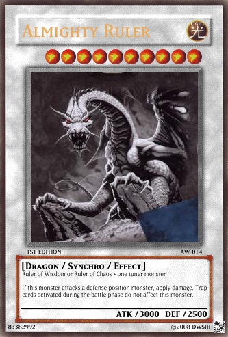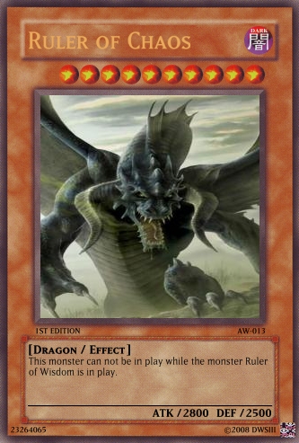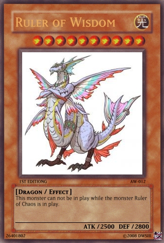 aussj4link Posted November 10, 2008 Report Share Posted November 10, 2008 I think they get angry if you use the attachment option instead of the img code. But I'll rate your cards anyway while I can. Hmmm your Ruler of Wisdom and Ruler of Chaos is a little underpowered for how many stars they have. The wording on Almighty Ruler is, I believe, incorrect, apply damage doesn't really specifiy anything. I believe it should be: "During battle between this attacking card and a Defense Position monster whose DEF is lower than the ATK of this card, inflict the difference as Battle Damage to your opponent's Life Points." and then probably the wording for the 2nd part should be something like: "This card is unaffected by Trap Cards during your Battle Phase." Other than that thought its kinda cool I guess, Like the pic's. 7/10 Link to comment Share on other sites More sharing options...