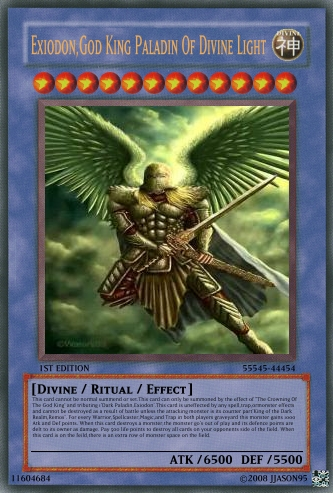 JJason95 Posted November 22, 2008 Report Share Posted November 22, 2008 Srry About earlier here is the card You cant read its effect so here it is. This card cannot be normal summoned or set. this card can only be summoned by the effect of'The Crowning of the God King' and tributing 1'Dark Paladin,Exiodon'.This card is not effected by magic,trap,or monster effects and cannot be destroyed as a result of battle unless the attacking monster is this cards counter part'King of the Dark Realm,Remos'.For every warrior,spellcaster,magic and trap card in both players graveyard, this card gains 1000 attack and defence points.When this card destroys a monster that monster go's out of play and its def points are delt to the owner as damage.Pay 500 lif points to destroy all cards on your opponents side of the field.When this card is on the field there is an extra row of monster space. Link to comment Share on other sites More sharing options...