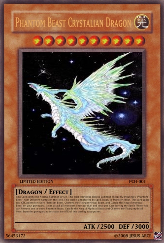 JaredKaiuki Posted November 23, 2008 Report Share Posted November 23, 2008 This is the New Booster Phantom Chaos Card sneak peak Please Postif you like it. This Card cannot be Normal Summon or Set. This card cannot be Special Summon except by tributing 5 "Phantom Beast" with Different names on the field. This card is unnafected by Spell,Traps, or Monster effect. This card gains 500 ATK points for every Phantom Beast, Chimera the Flying mythical Beast, and Gazele the King of mythical Beast on your graveyard. It can attack all monsters once per duel and once per turn durring the Battle Phase you can Remove one or more Phantom Beast, Gazelle the King of Mythical Beast and Chimera the Flying mythical beast from the graveyard to increase the ATK of this card by 1000 points. Link to comment Share on other sites More sharing options...