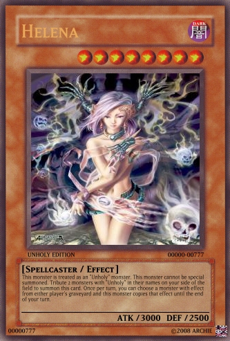gunxsword777 Posted December 24, 2008 Report Share Posted December 24, 2008 This monster is treated as an "Unholy" monster. This monster cannot be special summoned. Tribute 2 monsters with "Unholy" in their names on your side of the field to summon this card. Once per turn, you can choose a monster with effect from either player's graveyard and this monster copies that effect until the end of your turn. Link to comment Share on other sites More sharing options...