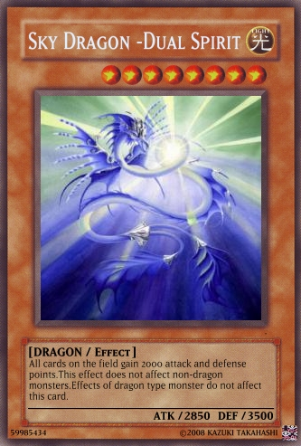 wusb8 Posted January 2, 2009 Report Share Posted January 2, 2009 this is a set i call sky dragons they have high attack but they are pretty kick butt...............soon i will make sky dragon-ultimate set 2 i will have more traps and spells and tuner monsters.:) Link to comment Share on other sites More sharing options...