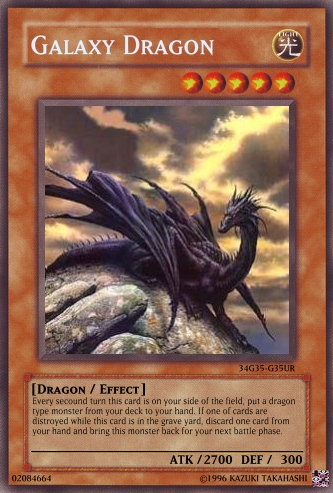 azz2k9 Posted February 22, 2009 Report Share Posted February 22, 2009 Azz2k9 [align=center] Card name: Ancient fairy dragon (i Made, if u dont believe me try and get it off google!) [URL=http://imageshack.us][IMG]http://img99.imageshack.us/img99/7951/ancientfairydragonenglie.png[/IMG][/URL] Effect: 1 Tuner + 1 or more non-Tuner monsters Once per turn, you can Special Summon 1 Level 4 or lower monster from your hand. If you activated this effect, you cannot enter your Battle Phase this turn. Once per turn, you can destroy 1 Field Spell Card you control to gain 1000 Life Points, then add 1 Field Spell Card from your Deck to your hand.[/align][hr] [align=center]Azz2k9 Card Name: Power Tool Dragon (i made this card, if u dont believe me try and get it off google u will only find japanise copies!) [URL=http://imageshack.us][IMG]http://img120.imageshack.us/img120/1278/powertooldragonenglish.png[/IMG][/URL] Effect: 1 Tuner + 1 or more non-Tuner monsters Once per turn during your Main Phase, you can select 3 Equip Spell Cards from your Deck. Your opponent chooses one at random. Add the chosen card to your hand and shuffle the others into your Deck. If this card would be destroyed, you can send an Equip Spell Card equipped to this card to the Graveyard to prevent this card from being destroyed. You can watch a video of all the cards i made!!! Go To http://www.youtube.com/watch?v=iR0n08Cd_Q0 P.M Me for your opinions! :D[/align] Link to comment Share on other sites More sharing options...
