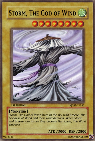 Blade360 Posted February 16, 2009 Report Share Posted February 16, 2009 [/font]Hey Ive been a member for a little while and haven't posted any of my cards so here it goes. Storm, the God of Wind Card Description - Storm, The God of Wind lives in the sky with Breeze, The Goddess of Wind and their wind demons. When Storm and Breeze join forces they become Hurricane, The Wind emperor Breeze, The Goddess of Wind Card Description - This card cannot be special summoned. EFFECT: you can add a maximum of 2 Wind Demons to your hand when this card is summoned. Wind Demon Card Description - A Wind Demon stays in the sky and when needed will protect its master or mistress. and the big guy Hurricane, The wind emperor Storm the God of Wind + Breeze The Goddess of Wind EFFECT: The turn this card is summoned all spell and trap cards on the opponents side of the field are destroyed. I dont know how to post the cards so you can just click and they come up, sorry Sites for the pictures - Breeze - http://www.quizilla.com/user_images/P/Piratica/1122780418_indgoddess.jpgStorm - http://www.quizilla.com/user_images/U/U2/U2I/u2isgr8t4u/1140641486_Wind.jpgWind Demon - http://th08.deviantart.com/fs25/300W/f/2008/140/c/b/Demon_Lukoi_final_by_guyver47.jpgHurricane was an upload so I dont know Thanks to Both Link to comment Share on other sites More sharing options...