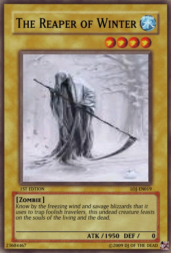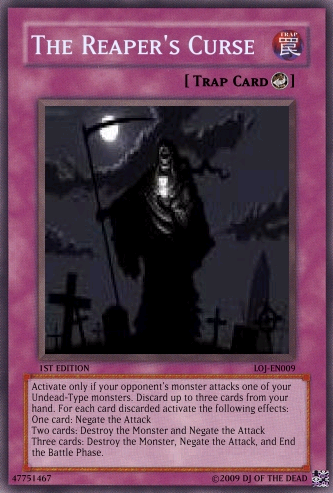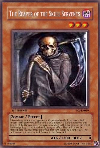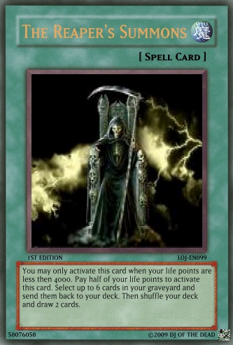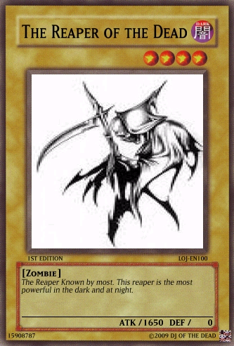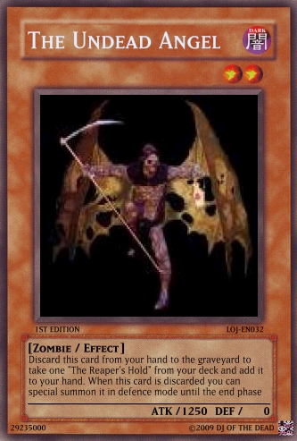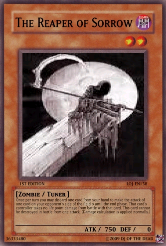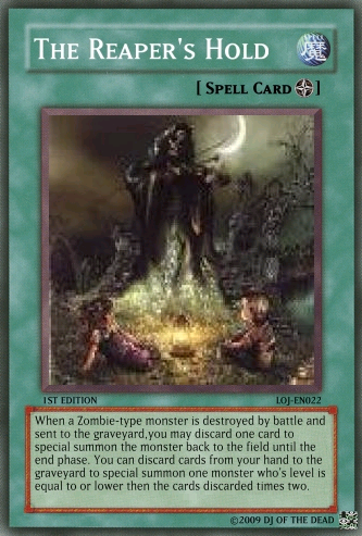 megaraptor Posted February 20, 2009 Report Share Posted February 20, 2009 Comment of any kind welcomed and tell me if the fourth horseman: death should remain as is or be a syncro Discard this card to the graveyard to send one Zombie-type monster (except Keeper of the Dead) from your graveyard to the deck. When this card is special summon send one Zombie-type from your deck to the grave. If there are no Zombie-type monsters in the graveyard send this card to your deck, shuffle and draw one card. Your turn then ends. If this is your only monster on your side of the field, you may not conduct battle phase.When this monster destroys a monster as a result of battle and inflicts damage to your oponent's life points, activate one of the two effects:Discard one card to special summon the monster to your side of the field until the end phase.Special summon one Level 3 or lower Zombie-type monster from your hand to the field in attack mode to the field. This monster cannot attack until the end phase.Once per turn you may discard one card from your hand to make the attack of one card on your opponent's side of the field 0 until the end phase. That card's controller takes no life point damage from battle with that card. This card cannot be destroyed in battle from one attack. (Damage calculation is applied normally.)Activate only if your opponent's monster attacks one of your Undead-Type monsters. Discard up to three cards from your hand. For each card discarded activate the following effects:One card: Negate the AttackTwo cards: Destroy the Monster and Negate the AttackThree cards: Destroy the Monster, Negate the Attack, and End the Battle Phase. This card may attack your opponent's life points directly if you have a Skull Servent in the graveyard. If this card attacks directly, it's attack is halved until the end of the Damage Step. This card is switched to Defence mode at the end of the Damage Step if it attacks directly using it's effect. This card cannot be changed back to attack mode until your next turn except by a card effect. This card's name is treated as Skull Servent in the Graveyard. You may only activate this card when your life points are less then 4000. Pay half of your life points to activate this card. Select up to 6 cards in your graveyard and send them back to your deck. Then shuffle your deck and draw 2 cards. Once per turn you may discard up to three cards from your hand to the graveyard to draw the same amount of cards from your deck.If this card is destroyed and sent to the graveyard you may discard your entire hand to the graveyard (must have at least two cards in your hand to activate this effect) to send the same amount of cards from your graveyard back to the deck and shuffle. The you Draw two cards. This card can only be ritual summoned with the Ritual Spell Card "The Reaper's Stare." Once per turn you may discard up to 5 cards from your hand to destroy the same amount of cards on the field that you discarded. If you activate this effect this card cannot attack this turn. This card cannot be targeted by monster attacks if there is another Zombie-type monster on the field. If there is no other Zombie-type monster on the field this card is destroyed and sent to the graveyard. When this card destroys a monster as a result of battle, you may discard 2 cards to special summon one Zombie-Type monster with 1500 Defense points or less (except Reaper on the Hell Horse) from your deck in Attack Position during the End Phase.When a card(s) is discarded from your hand by a cost or a card effect from an undead type monster, your oponent must discard the same amount of cards that you discarded from the top of the deck to the graveyardDiscard this card from your hand to the graveyard to take one "The Reaper's Hold" from your deck and add it to your hand. When this card is discarded you can special summon it in defence mode until the end phaseWhen a Zombie-type monster is destroyed by battle and sent to the graveyard,you may discard one card to special summon the monster back to the field until the end phase. You can discard cards from your hand to the graveyard to special summon one monster who's level is equal to or lower then the cards discarded times two.Each time a card is discarded by a card effect or cost, activate the correct effect:*Monster effect: Gain 1000 Life points.*Spell: Draw two cards.*Trap: Send two cards from your deck to the graveyard.You may activate this card only once per turn.Activate this card only when your life points are less then your opponent's and are in your opponent's battle phase. Pay 2000 life points to destroy all cards on the field. Then special summon as many Zombie-type monsters as the cards destroyed on your opponent's side of the field.Activate this card only when "The Reaper on the Hell Horse" is destroyed. Special summon one "The Fourth Horseman: Death" from your deck; hand; or Graveyard.This card cannot be normal summoned or set. This card can only be special summoned by the effect of The Call of the Four Horseman: Death. When this card is special summoned, you may destroy all cards on the field. When this card does damage to your opponent, place one Apocalypse counter on this card. When this card has four Apocalypse counters you win the Duel. When this card attacks it is switched to defense postion at the end of the damage step. This card cannot be switched back (includeing card effect) until the end of your opponent's Second turn. This card cannot be destroyed by battle except by a Zombie-type monster (damage is calculated normally). If this card is destroyed by a card effect you may discard three cards from your hand and remove from play three Zombie type monsters in the graveyard to special summon this card back in attack mode during the end phase.The Reaper of Sorrow + 1 or more non-Tuner monstersOnce per turn you may discard two cards from your hand to special summon one Zombie-type monster from your graveyard in Attack mode until the E