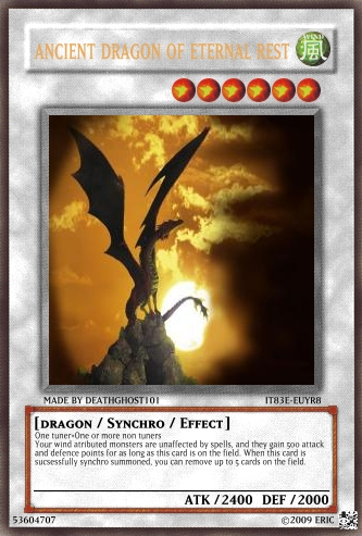 blazejecar Posted March 13, 2009 Report Share Posted March 13, 2009 ok then here are the cards:lore:1 tuner+1 or more non-tuner monstersThis card cannot be Special Summoned except by Synchro Summon.When this card is Synchro Summoned succesfully, destroy one card on the Field.If this card is attacked, draw one card from your Deck.If the card is not a pyro type monster, destroy this card before damage calculation.When a pyro type monster is destroyed, you can pay 500 life points to Special Summon as many lvl4 or lower pyro type monster from your Graveyard.(fire element) lore:This card cannot be Normal Summoned or Set.This card cannot be Special Summoned except by tributing 3 water attribute monsters from your side of the Field.This cards ATK increases by the number of water attribute monsters in your Graveyard x200 points.When this card is destroyed as a result of battle, you can remove 2 water attribute monsters in your Graveyard from Play to Special Summon this card back to your side of the Field douring the standby phase of your turn.(water element) Link to comment Share on other sites More sharing options...
