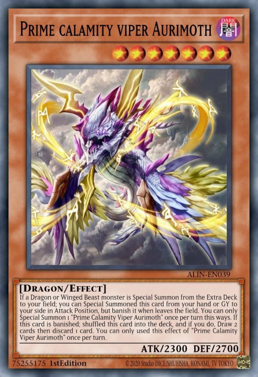 Prime Calamity Viper Aurimoth [DARK] LV 7/Dragon/Effect (2300/2700) If a Dragon or Winged Beast monster is Special Summon from the Extra Deck to your field; you can Special Summoned this card from your hand or GY to your side in Attack Position, but banish it when leaves the field. You can only Special Summon 1 "Prime Calamity Viper Aurimoth" once per turn this ways. If this card is banished; shuffled this card into the deck, and if you do, Draw 2 cards then discard 1 card. You can only used this effect of "Prime Calamity Viper Aurimoth" once per turn.2 points