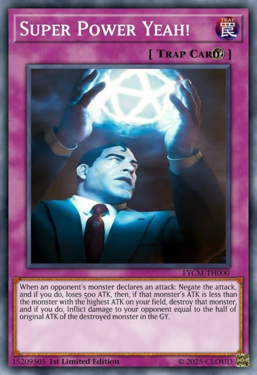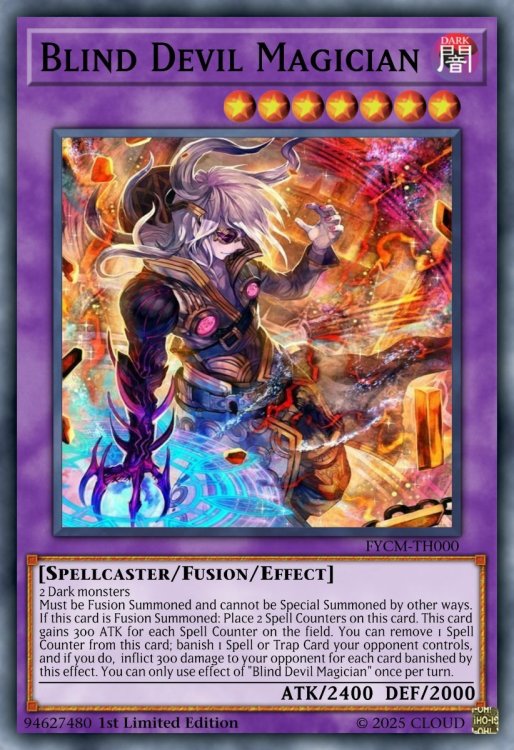 I would like permission to use the picture to make another card. I feel sorry for the beautiful art. Blind Devil Magician DARK Level 7 Spellcaster/Fusion/Effect 2 Dark monsters Must be Fusion Summoned and cannot be Special Summoned by other ways. If this card is Fusion Summoned: Place 2 Spell Counters on this card. This card gains 300 ATK for each Spell Counter on the field. You can remove 1 Spell Counter from this card; banish 1 Spell or Trap Card your opponent controls, and if you do, inflict 300 damage to your opponent for each card banished by this effect. You can only use effect of "Blind Devil Magician" once per turn. ATK/2400 DEF/2000 Super Power Yeah! Trap Card (Counter) When an opponent's monster declares an attack: Negate the attack, and if you do, loses 500 ATK, then, if that monster's ATK is less than the monster with the highest ATK on your field, destroy that monster, and if you do, Inflict damage to your opponent equal to the half of original ATK of the destroyed monster in the GY. Next:2 points
