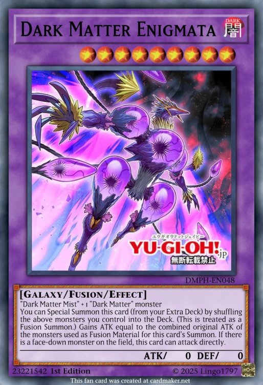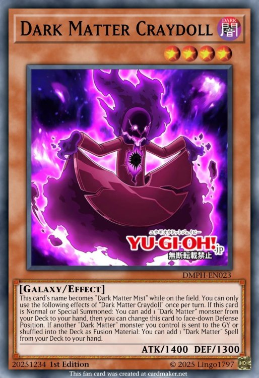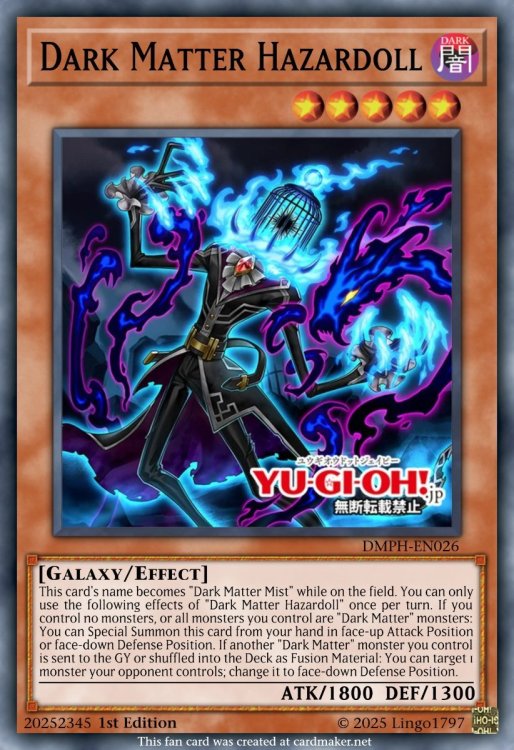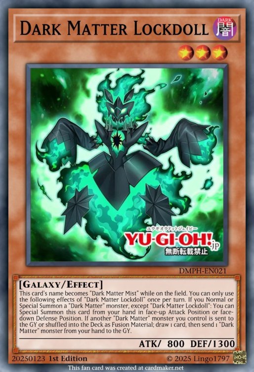I'm on a little personal mission to TCG-ify Rush decks that I find interesting. I made a bunch on Duelingbook, but the site's servers are really in decline at the moment. Here's my take on a few of the Dark Matter monsters from Go Rush. More to come as this is very much WIP. Dark Matter Hazardoll Galaxy/DARK/Level 5/ATK 1800/DEF 1300 This card's name becomes "Dark Matter Mist" while on the field. You can only use the following effects of "Dark Matter Hazardoll" once per turn. If you control no monsters, or all monsters you control are "Dark Matter" monsters: You can Special Summon this card from your hand in face-up Attack Position or face-down Defense Position. If another "Dark Matter" monster you control is sent to the GY or shuffled into the Deck as Fusion Material: You can target 1 monster your opponent controls; change it to face-down Defense Position. Dark Matter Craydoll Galaxy/DARK/Level 4/ATK 1400/DEF 1300 This card's name becomes "Dark Matter Mist" while on the field. You can only use the following effects of "Dark Matter Craydoll" once per turn. If this card is Normal or Special Summoned: You can add 1 "Dark Matter" monster from your Deck to your hand, then you can change this card to face-down Defense Position. If another "Dark Matter" monster you control is sent to the GY or shuffled into the Deck as Fusion Material: You can add 1 "Dark Matter" Spell from your Deck to your hand. Dark Matter Lockdoll Galaxy/DARK/Level 3/ATK 800/DEF 1300 This card's name becomes "Dark Matter Mist" while on the field. You can only use the following effects of "Dark Matter Lockdoll" once per turn. If you Normal or Special Summon a "Dark Matter" monster, except "Dark Matter Lockdoll": You can Special Summon this card from your hand in face-up Attack Position or face-down Defense Position, If another "Dark Matter" monster you control is sent to the GY or shuffled into the Deck as Fusion Material; draw 1 card, then send 1 "Dark Matter" monster from your hand to the GY. Dark Matter Enigmata Galaxy/Fusion/DARK/Level 9/ATK 0/DEF 0 "Dark Matter Mist" + 1 "Dark Matter" monster You can Special Summon this card (from your Extra Deck) by shuffling the above monsters you control into the Deck. (This is treated as a Fusion Summon.) Gains ATK equal to the combined original ATK of the monsters used as Fusion Material for this card's Summon. If there is a face-down monster on the field, this card can attack directly.2 points