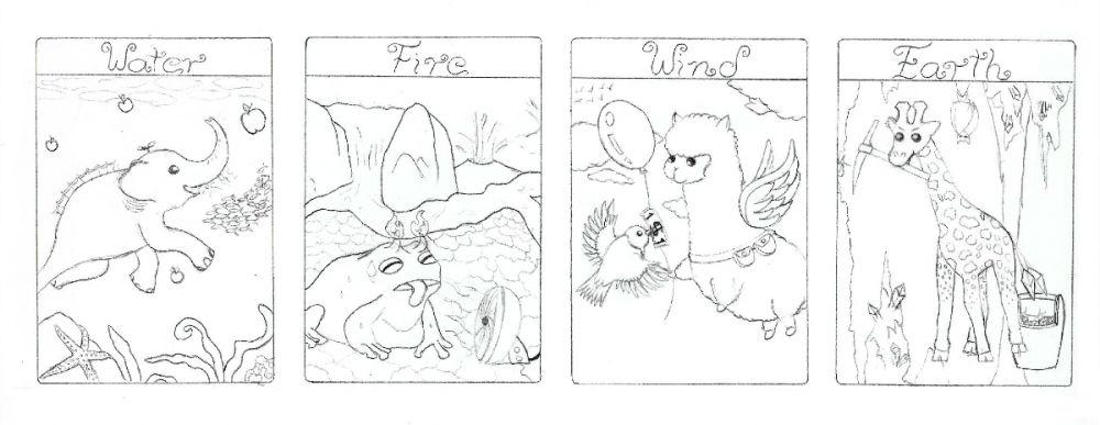 Guess I'll post this over here as well xD Water - Little Aqua Elephant hunting for food in Apple Lake (best place) Fire - Demon Frog can't take any more heat at the Volcano (Fan powered by an off-screen Electric-Lava Eel) Wind - Flying Alpaca selling a ballon to passing birds (1 buck, each) Earth - Gem-Giraffe mining for the riches (don't ask me how such a tall animal manages)6 points