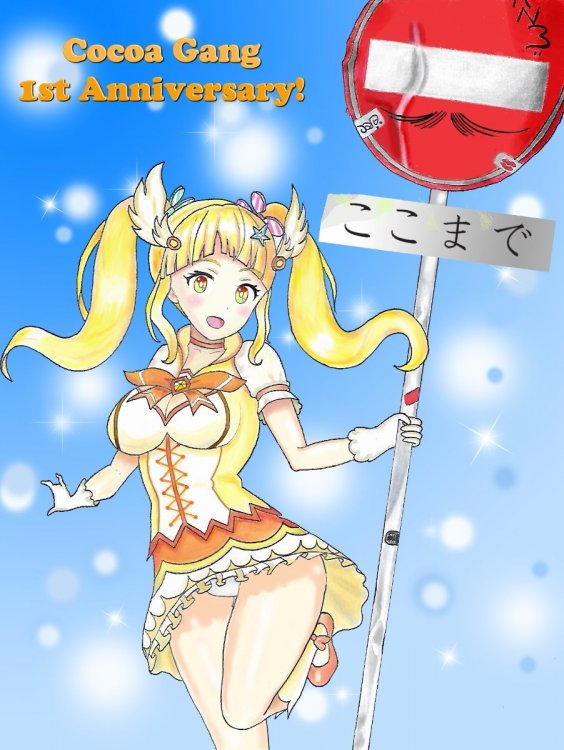 OMG she's super cute, I really like her design n.n I request that you make her a Leader in your TCG and make an archetype of knitted monsters. If by chance you think: but her attire has nothing to do with the TCG, you can just give her some sort of Magical Girl-ish costume and we all will be happy. Mini skirt powaa. And talking about Magical Girls, here's my finished drawing of Cocoa. Made to celebrate, as it says in the image, the first anniversary of the server of my club6 points