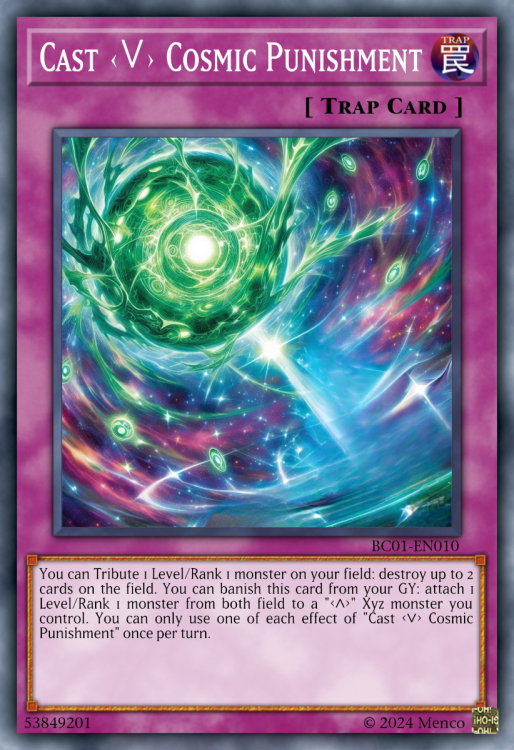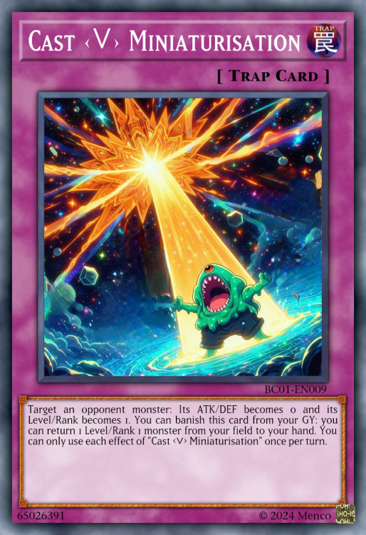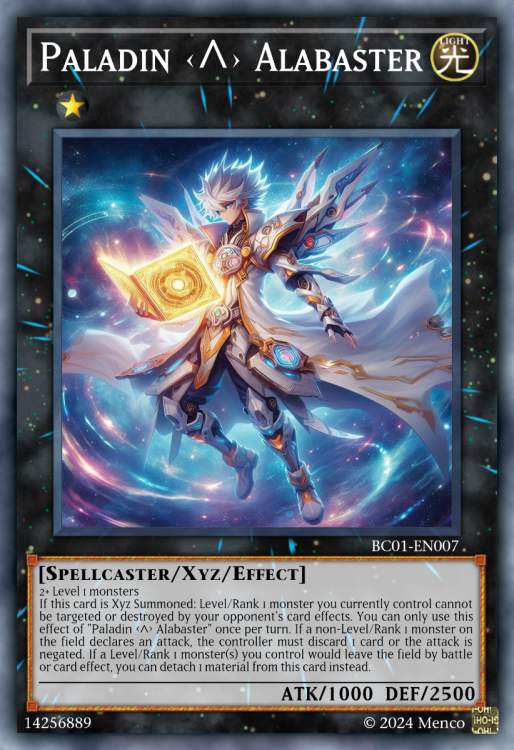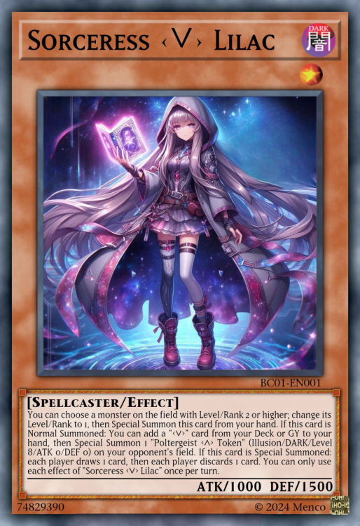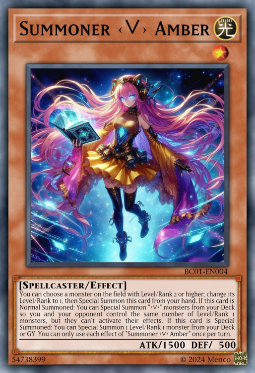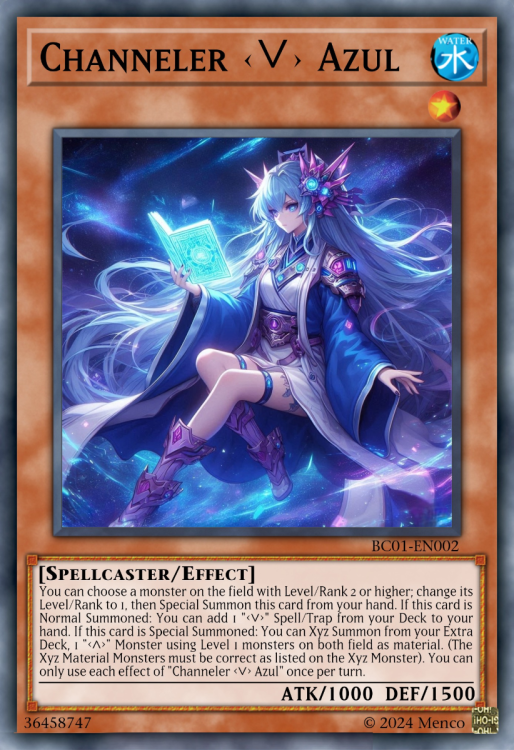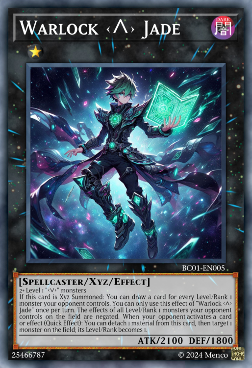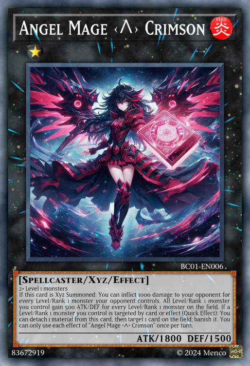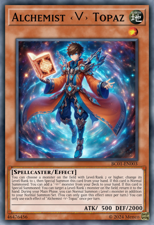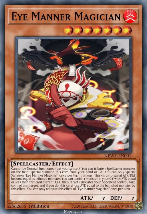 "Eye Manner Magician" [FIRE] Level: 7 Type: Spellcaster ATK/? DEF/? Cannot be Normal Summoned (but you can set). You can tribute 1 Spellcaster monster on the field; Special Summon this card from your hand or GY. You can only Special Summon "Eye Manner Magician" once per turn this way. This card's original ATK/DEF become equal as tributed monster. You can banish 1 monster in your GY with ATK equal or less than this card current ATK, then target 1 monster your opponent control; take control that target, and if you do, this card lose ATK equal to the ATK of banished monster by this effect. You can only activate this effect of "Eye Manner Magician" once per turn.3 points